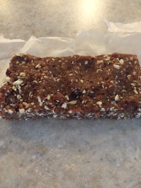 I turned the food processor on and let it do its thing.  Then press the ingredients in a 8 by 8 pan and freeze for 30 minutes or put in the fridge for an hour.  Remove and slice into bars.  Individually wrap and store.