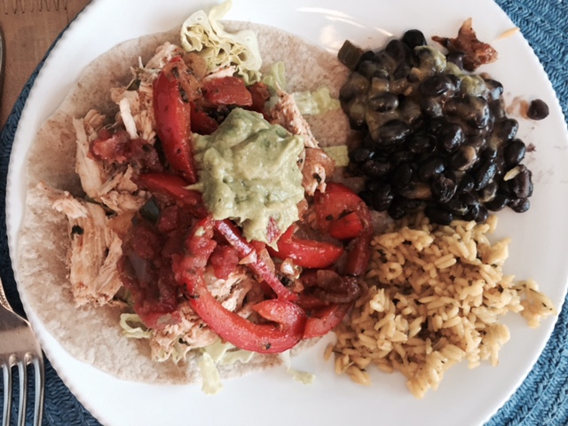For the tacos, I boiled 2 chicken breasts in water and then shredded the chicken and tossed it with taco seasoning and Mexican hot sauce. I sauteed an onion, a red pepper, a jalapeno (stem and seeds removed), tomatoes in some olive oil and butter. After the vegetables got soft I tossed the mixture with cilantro, lime juice and taco seasoning. I topped my taco with the chicken mixture, the sauteed vegetables, lettuce, salsa and guacamole. It was a delicious combination!