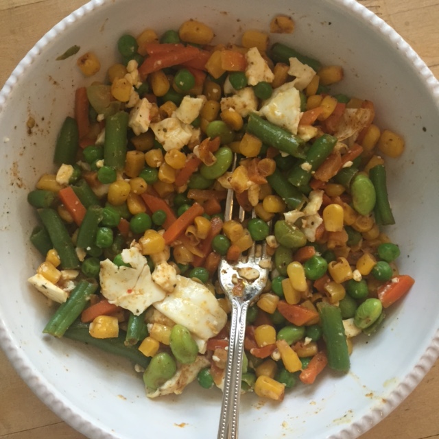 For lunch I had my go to meal: a vegetable bowl with an over easy egg and feta cheese. I had a side of carrots and guacamole and a few pita chips with the crab dip we bought at King’s Market this weekend.