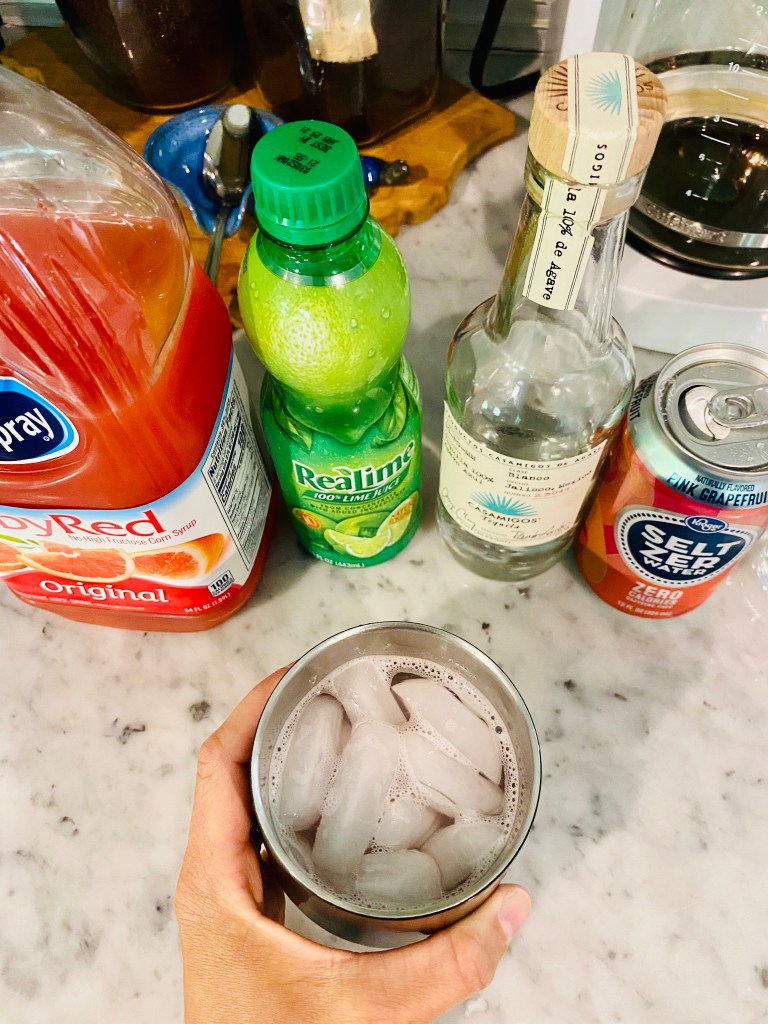 - fill the rest of the glass with sparkling grapefruit seltzer water (I use Kroger brand, tastes as good as name brand in my opinion)